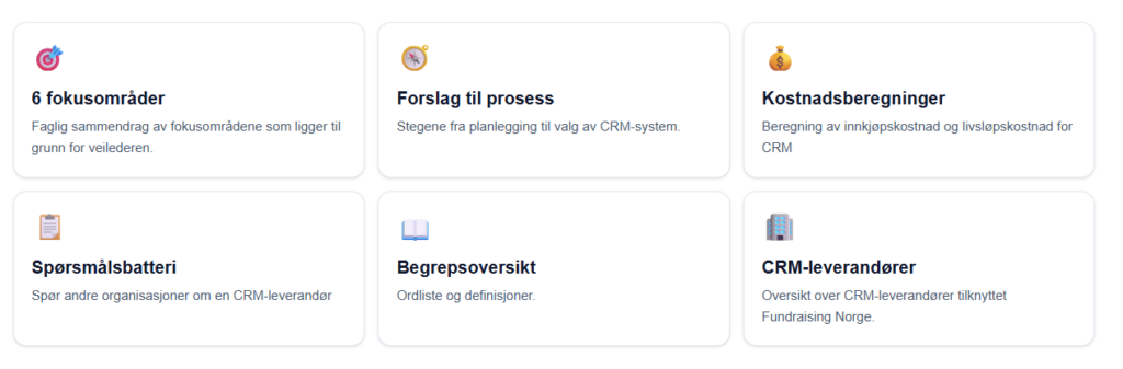 Hensikten med denne veilederen er å hjelpe organisasjoner til en bedre og enklere prosess når de skal vurdere å gå til innkjøp av ny CRM-løsning. CRM-veilederen skal ferdigutvikles i samarbeid med medlemmene og vi inviterer alle til å teste den. Vi tar gjerne imot tilbakemeldinger fra dere som velger å teste løsningen. Lenken finner dere under og tilhører foreløpig et av våre leverandørmedlemmer, Dialog Norge.