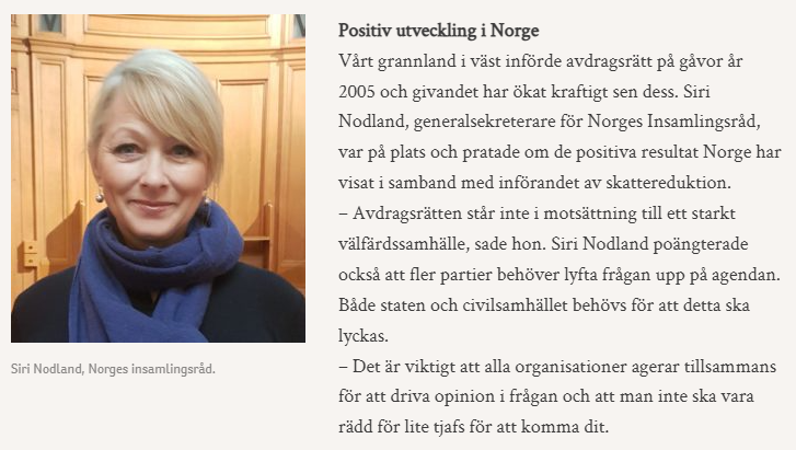 Skattefradrag på gaver til ideelle organisasjoner i Sverige har økt gradvis gjennom årene. I 2019 var det Norge man så til som et godt eksempel på hvordan staten tilrettela for private gaver til ideell sektor. Fundraising Norges generalsekretær Siri Nodland, (når vi het Norges Innsamlingsråd) talte i april 2019 i den svenske Riksdagen om de positive ringvirkningene av den daværende politikken som ble ført på skattefradrag på gaver.